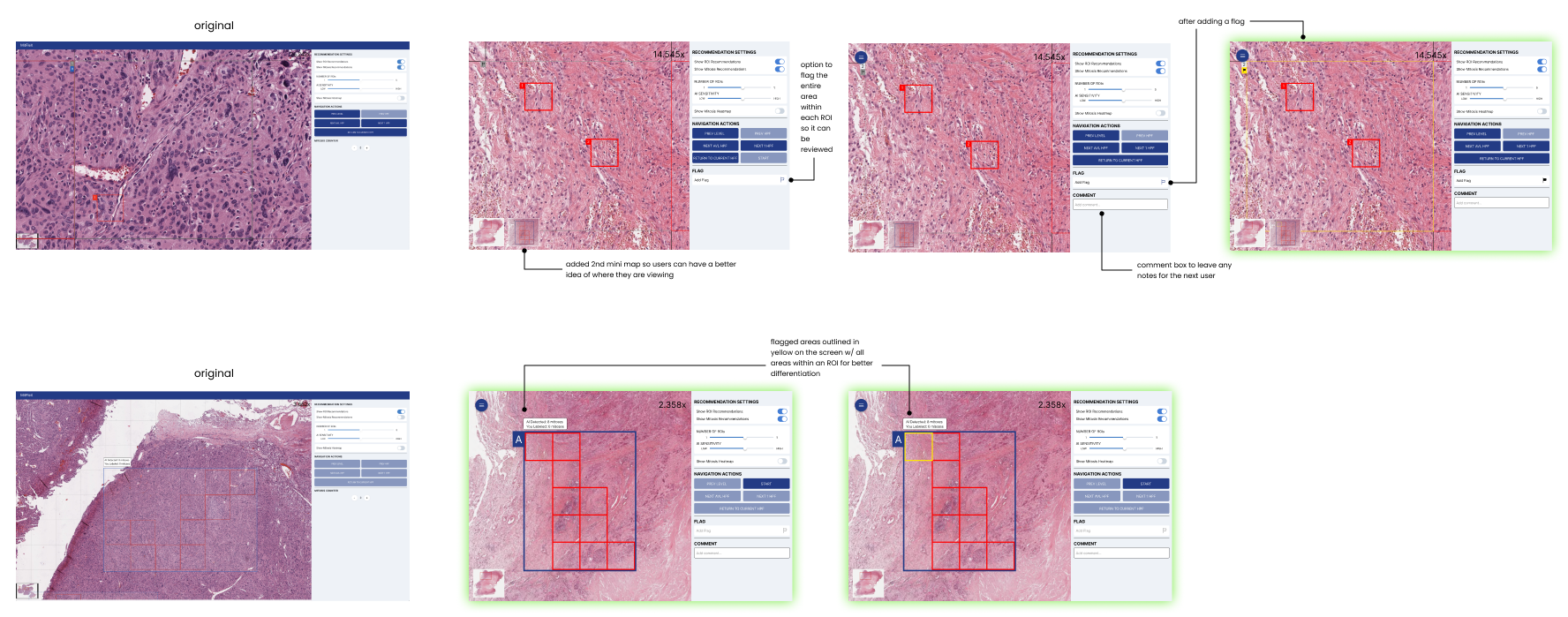 Upon request, I added a comment box, so users can leave any comments and/or concerns. I also added a flag button, allowing the user to flag a specific HPF within an ROI. Flagged areas would be a yellow color, indicating to the second user that these HPFs need to be reviewed. The two mini maps on the bottom left were added to help users get a better sense of where they are viewing.