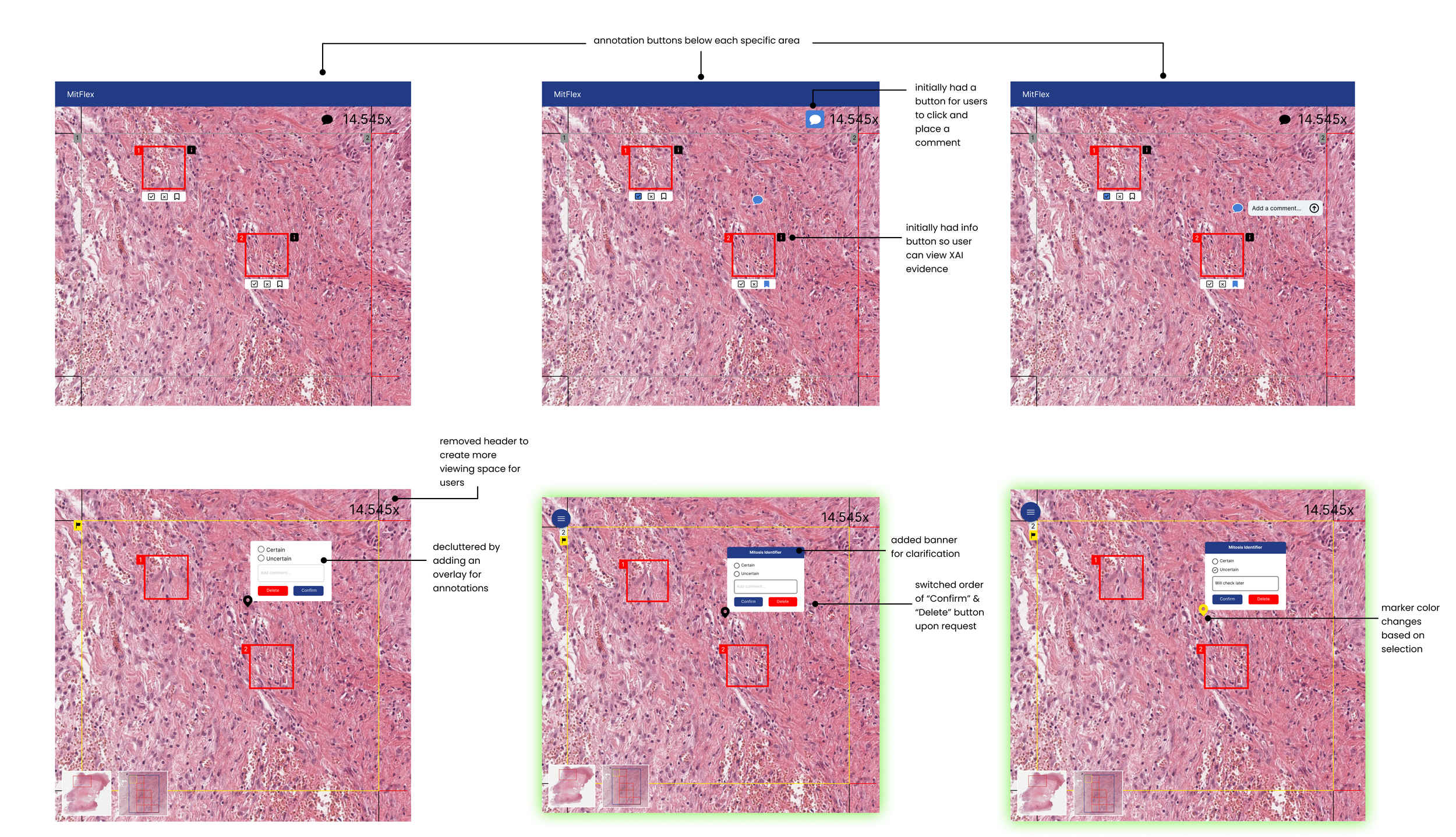 MitFlex is an artificial intelligence- (AI) aided navigation system that assists pathologists with mitosis identification when looking at whole-slide images. During Winter 2024, I joined UCLA HCI Research’s ongoing project under the guidance of Ph.D. student Hongyan Gu and Dr. Xiang ‘Anthony’ Chen and re-designed the existing system used by pathologists.
