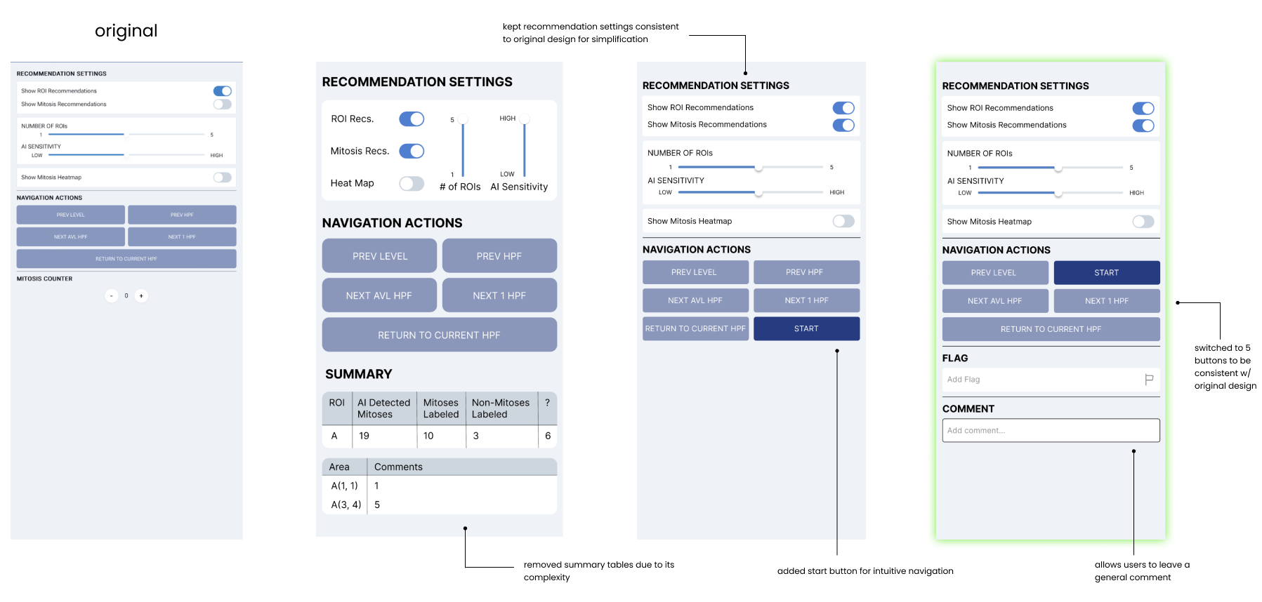 I initially added summary tables that show users the annotations made in each ROI, as well as which high-power field (HPF) that comments were left in, so that they could be quickly reviewed. However, the developers were unable to implement these ideas within the time frame, so I removed the tables and kept the design similar to that of the current system. I was then asked to make the beginning of the navigation process more intuitive. Thus, I added a “Start” button so that users can easily begin the navigation. I kept 5 total buttons under the “Navigation Actions” section in order to remain consistent with the original design and make it less complicated for developers.