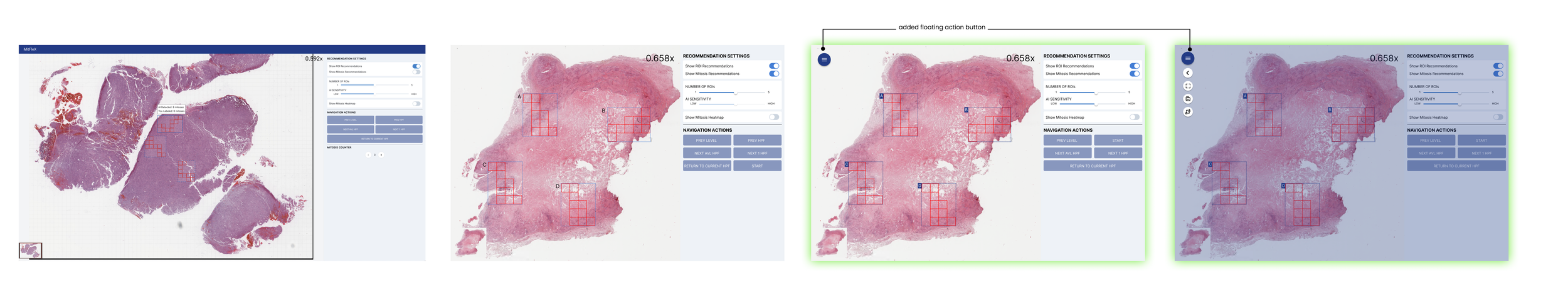 For the screen of a specific HPF within an ROI, I started off by adding a “yes,” “no,” and bookmark button under each recommended mitotic area. However, after receiving feedback from my mentor, I realized that we do not need to identify that something is NOT a mitosis, so we would not need a “no” button. I was also informed that the buttons below each area appeared too crowded, so I completely removed them.
